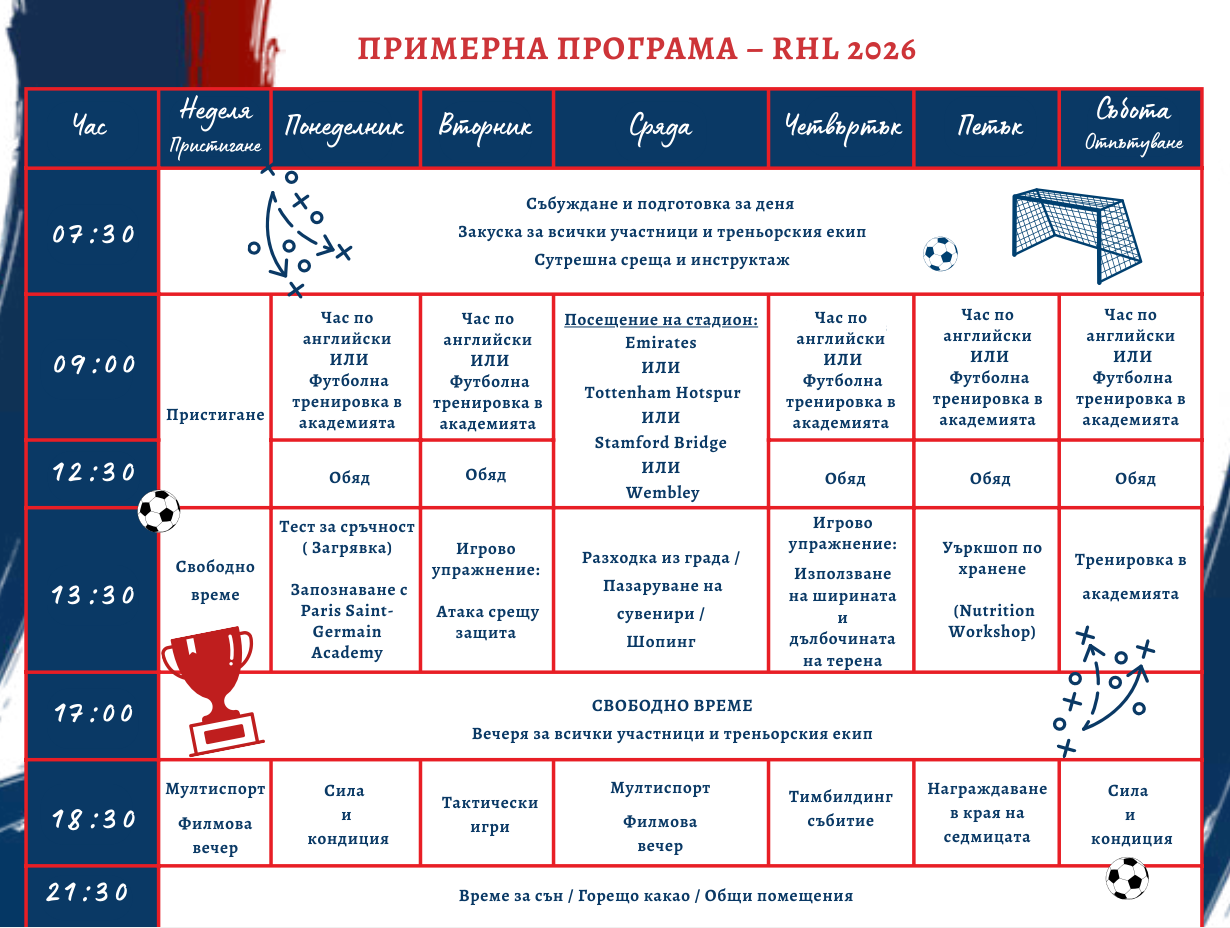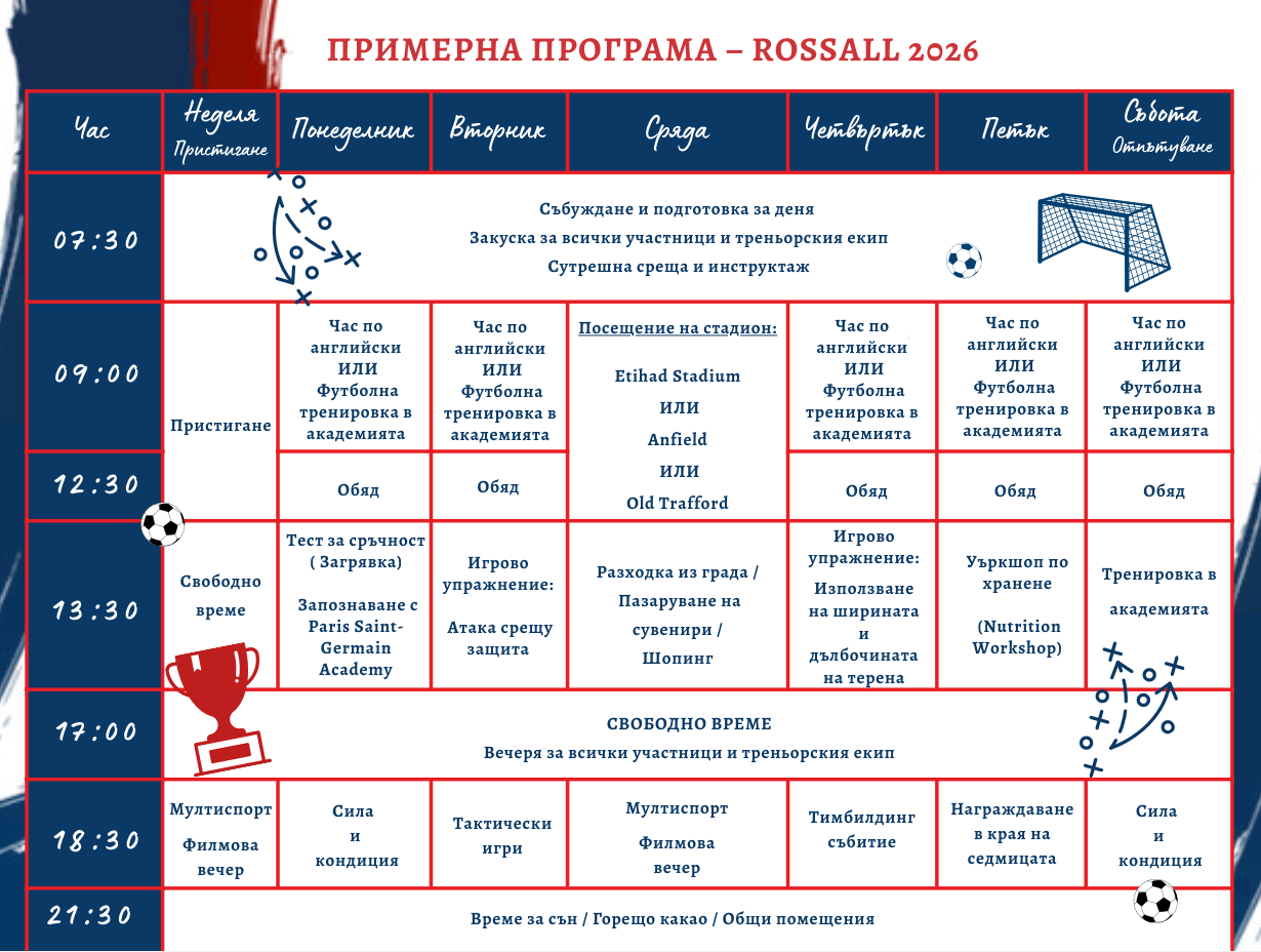 Резидентната програма в Rossall School позволява на участниците да се потопят в английската култура в традиционна британска училищна среда, като същевременно развиват своите футболни умения и знания.